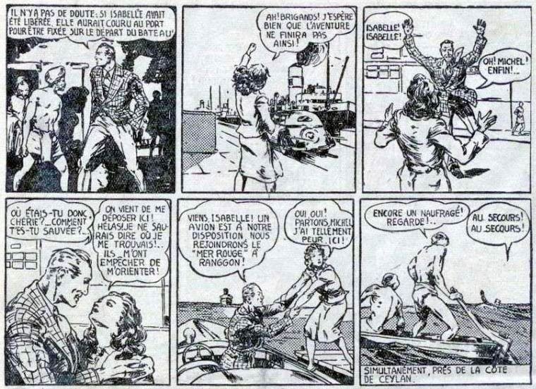 For its time, 'Will Sparrow' was a remarkable comic, as it had a villain in the starring role. Between 1944 and 1946, Van Straelen drew more stories with this air pirate and his accomplice Mark Park for Daubin's further publications. 'Le Fléau des Mers du Sud' (issue #10, 1944 - reissue from 1942), 'Le Train 725 a Disparu' (issue #18, 1945), 'Les Perles de la Mer d'Oman' (issue #20, 1945), 'Le Vase Sacré des Dasyous' (issue #26, 1946) and 'Les Évadés du Tibet' (issue #29, 1946) appeared in the Collection Odyssées, while the serials 'Le Cité Engloutie' (1946-1947), 'Le Roi des Ténèbres' (1947), 'Will Sparrow Contre Mark Park' (1947) and 'L'Empereur du Silence' (1947) ran in Jeudi Magazine and its successor Zorro-Hebdo. The series was continued in the collections Les Sélections Hardi les Gars! and Héroïca Présente with the episodes 'Gilda l'Atomique' (1947), 'La Course au Trésor' (1948), 'Feux Croisés' (1948), 'Tempête sur l'Antarctique' (1948), 'Havre Sans Marins' (1948) and 'Les Loup se Mangent Entre Eux' (1949).