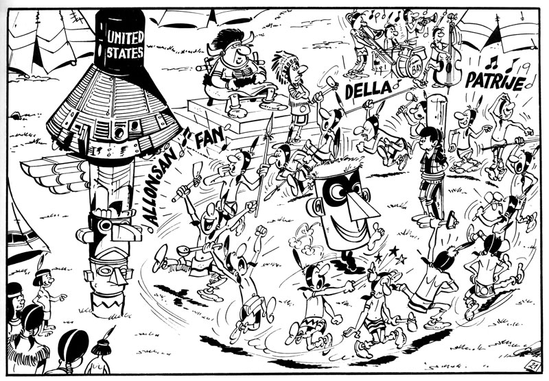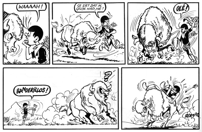 In 1968 and 1969, Vandemeulebroucke also made comics for the weekly opinion magazine De Post. First in line was the serial 'Lamerika: Het Ei van Columbus' (1968-1969), an attempt to adapt the history of America in humorous comic format, written by the teacher Adolf Van Cauter under the pen name "Plinius". Because the Catholic editors of De Post wanted elements like the Inquisition left out, the project stranded after only one episode. Another series was the gag comic 'Felix en de Marsman' (1969), about a robot mistakenly created by the main computer of a bank.