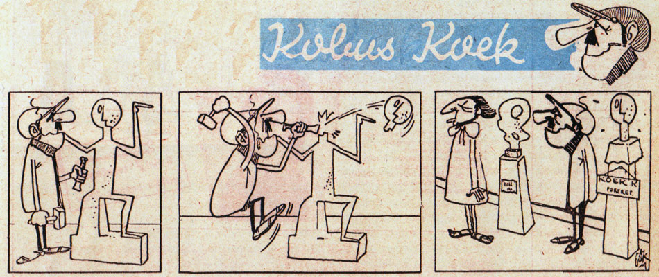 From early 1963 until early 1964, Vandemeulebroucke fulfilled his military service with the Belgian Air Force in Tongeren. Because of his drawing talent, he was assigned to the Welfare division, that provided cultural entertainment for soldiers working in the nearby NATO base. Among his jobs was making illustrations for the bi-monthly magazine Info-Flits. During the same period, he was hired as an illustrator for De IJsbereider, a monthly trade journal for the ice cream industry. Back in civilian life, Erik became a revisor and occasional illustrator for the printing firm Govaerts in Deurne. He did the lay-outs for Sodipa, a monthly magazine for personnel of the Antwerp municipality. After winning a contest, Vandemeulebroucke saw two of his gag strips with the characters 'Kol & Knopke' published in the children's weekly 't Kapoentje (in May and June 1965). Also in May, his gag comic 'Cyriel en Cesar' ran in newspaper Het Volk.