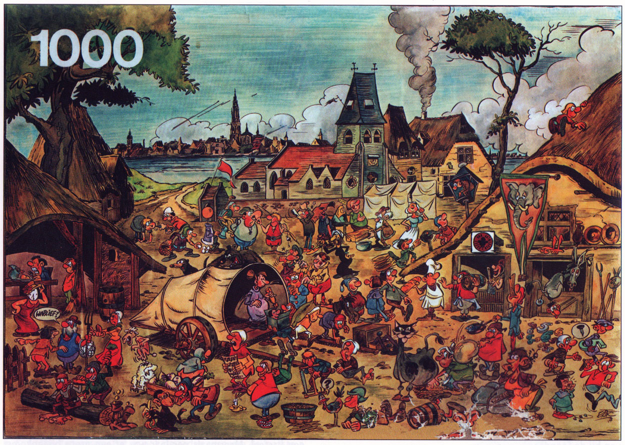 Another notable feature for Gazet van Antwerpen by Vandemeulebroucke were his drawings based on proverbs and sayings. Between 1974 and 1976, he provided the newspaper with three large-format posters, visualizing Antwerp sayings, street names and nicknames of regional towns. His 1974 poster of Antwerp sayings was later also released as a jigsaw puzzle. Between 1989 and 1994, Erik illustrated contests about local proverbs and sports sayings. Every day, a Vandemeulebroucke cartoon appeared in the paper, visualizing a well-known proverb, saying or other riddle. The proverb contest proved so popular that for years, Flemish elementary schools used his drawings to teach pupils proverbs. Some of these drawings were also included as illustrations in crossword puzzle books. With these remarkable cartoons, Vandemeulebroucke also carried on a long-running Flemish tradition, since painters like Frans Hogenberg and Pieter Bruegel the Elder, as well as cartoonists like Jef Nys, have all visualized Dutch-language proverbs and sayings before him.