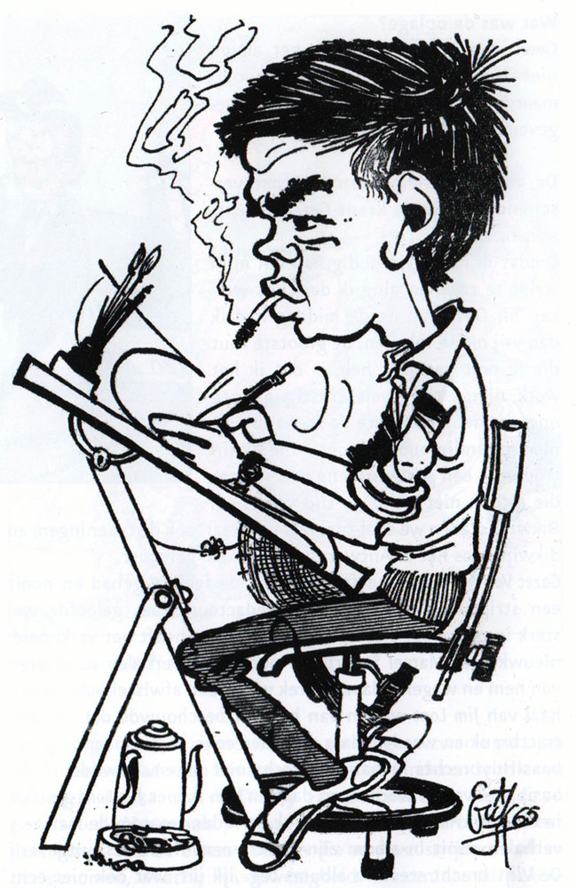Erik Vandemeulebroucke was a Belgian comic artist, cartoonist and advertising illustrator. Together with his brother Ignaas, he made the humorous spy comic 'Jim Lont' (1965-1969). In the early 1970s, he was active for Karel Verschuere's 'Tom Berry' production and produced comics for Rolf Kauka in Germany. For decades, Vandemeulebroucke was house cartoonist of the newspaper Gazet van Antwerpen, best remembered for his annual illustrations of the Tour de France. His gag comic 'Dobberman en Van Geyt' (1973-1975), scripted by Wim Tocquet, ran in De Antwerpse Post. Later in his career, Vandemeulebroucke founded the silkscreen printing firm Breughel Screen/Breughel International (1977-2019), which stood out for its sticker production. He signed his work with only his first name, Erik. He should not be confused with the French artist André Joly, who also used Erik as his pen name.