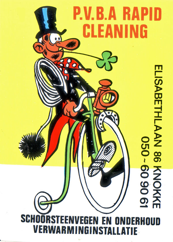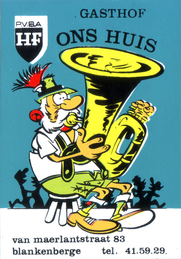 From the 1970s on, Vandemeulebroucke made a lot of advertising art. For the discount shop chain N.V. Oranjehuis, he made the 1973 'Bertje' comic book, of which the panels had to be collected as stickers. In 1974, he drew the comic booklet 'De Bokkesprongen van Berreke Bluf', promoting the local cycling race of the Royal Sportingclub Wilrijk. In 2013, this particular book received a limited re-release by Brabant Strip. Vandemeulebroucke also created promotional illustrations for INZA milk, the stores Ratio and Aldi and the shopping center De Kern in Wilrijk. For the Belgian division of the Danish transport and logistics group Gondrand, located in Bornem, Vandemeulebroucke designed 16 stickers. Each visualized a country that Gondrand delivers its products too. Around the same period, Vandemeulebroucke's cards visualizing dishes and house rules appeared in bars and restaurants throughout Flanders. His beer coasters with drawings of proverbs in Antwerp dialect promoted both the newspaper Gazet van Antwerpen and the brewery De Coninck. Some of these drawings have been used in puzzle books too.