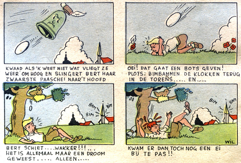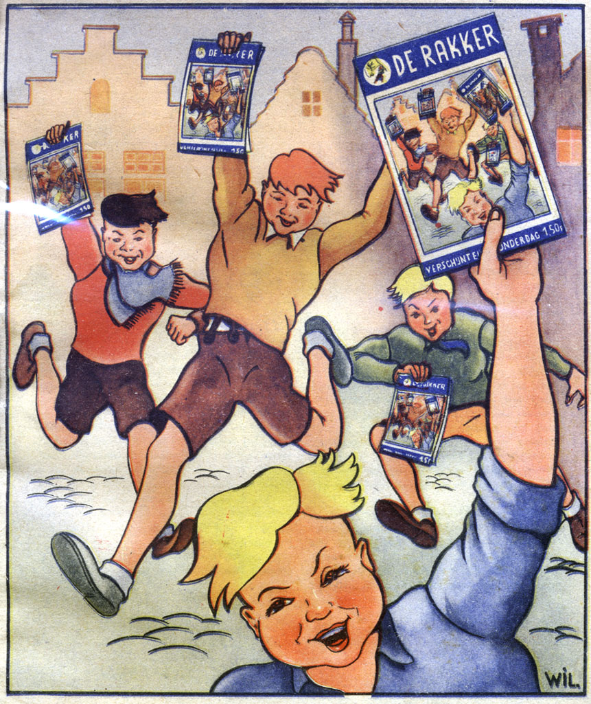 On 3 February 1944, Vandersteen turned up in the first issue of the children's magazine De Rakker. He illustrated a couple of covers and columns, including those by the poet Bert Peleman. Peleman then scripted Vandersteen's text comic 'Bert, De Lustige Trekker' (1944), about a joyful boy scout, whose adventures ran until the magazine's final issue on 28 August of that same year. Vandersteen and Peleman collaborated again in De Illustratie, a weekly sister magazine of the Nazi publication Volk en Staat, for which they created the text comic 'Peerke Sorgloos' (18 February 1944). The droll jokes of this befuddled old gentleman were signed by Vandersteen as "Wil" or "Pim", while Peleman wrote the rhyming sentences that appeared underneath each image. The series continued until September 1944, when Belgium was liberated by the Allied Forces.