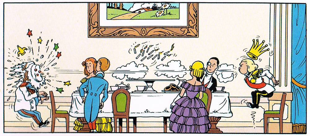 The 'Suske & Wiske' story 'De Sprietatoom' (1946) also marked the debut of Lambik, who instantly became the series' most popular character. Named after Vandersteen's favorite beer brand Gueuze Lambic, he provides most of the comic relief. Lambik is a clumsy, vain and short-tempered fool. The so-called "plumber-detective" constantly overestimates his own abilities. Many of his blunders have become classic, such as pinning a note to excuse his absence "because I'm not here", or giving villains his weapon, so he can strip search them for guns. Overall, Lambik is the archetype of the Belgian soul: a simple-minded bon vivant who enjoys a nice, cool beer. Precisely for this reason, many readers identify with him.