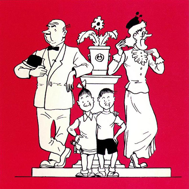 Tante Sidonie is Suske and Wiske's adoptive aunt. At the time, there was an unwritten rule that comic characters could not have children of their own, as this would imply sexual intercourse. But Vandersteen merely felt that real parents would never allow their offspring to go on dangerous adventures, so an aunt made "more sense". The 'Suske en Wiske' series is unique for a children's comic, as the kids are never seen at school. Their school life is not even hinted at. Although a surrogate parent, Sidonie cares a lot about Suske and Wiske, providing the series with a strong family dynamic. In an additional rule for early comics, adult female comic characters weren't allowed to be attractive. So Sidonie is presented as an ugly flat-chested spinster, with a big nose, chin and feet. Her thin, flexible body was inspired by E.C. Segar's Olive Oyl. Many gags poke fun at the odd ways she can bend her body, her nervous breakdowns, her constant search for a man and temper tantrums. But much like Wiske, she is, considering the times, a remarkably strong, inventive and intelligent female character.