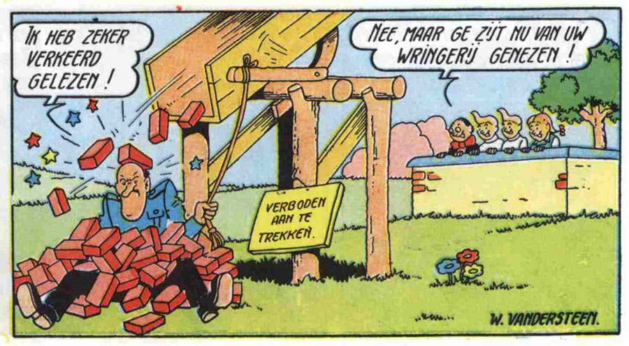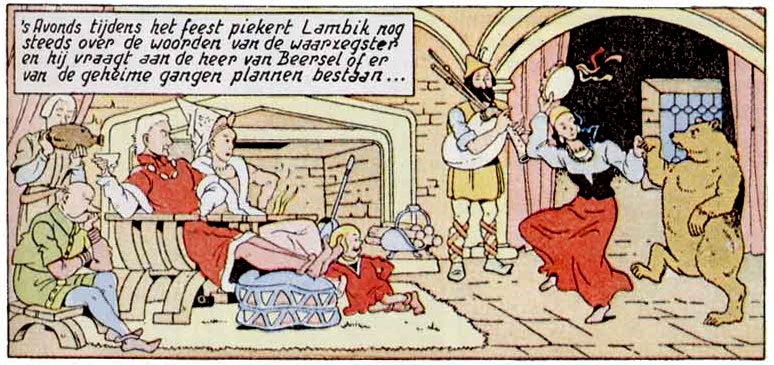 One of Vandersteen's greatest strengths was his ability to tell captivating stories. He deliberately ended every episode on a strong cliffhanger. Recurring elements are secret doors, mysterious manuscripts and masked people refusing to reveal their identity. He often stretched readers' patience weeks on end, to hilarious degrees. In 'De Bokkenrijders' (1948), for instance, Sidonie reads a manuscript but the final page drops on the floor, so the revelation has to wait until the next episode. In other stories, the cliffhanger just turns out to be the set-up for a joke, like in 'De Mottenvanger', when Lambik hears about the end of the world and his wall crumbles. In the next episode, it turns out somebody merely drove his car into his house. Vandersteen tingled audience curiosity so often that people started reading their newspapers backwards, just so they could check the funnies first.