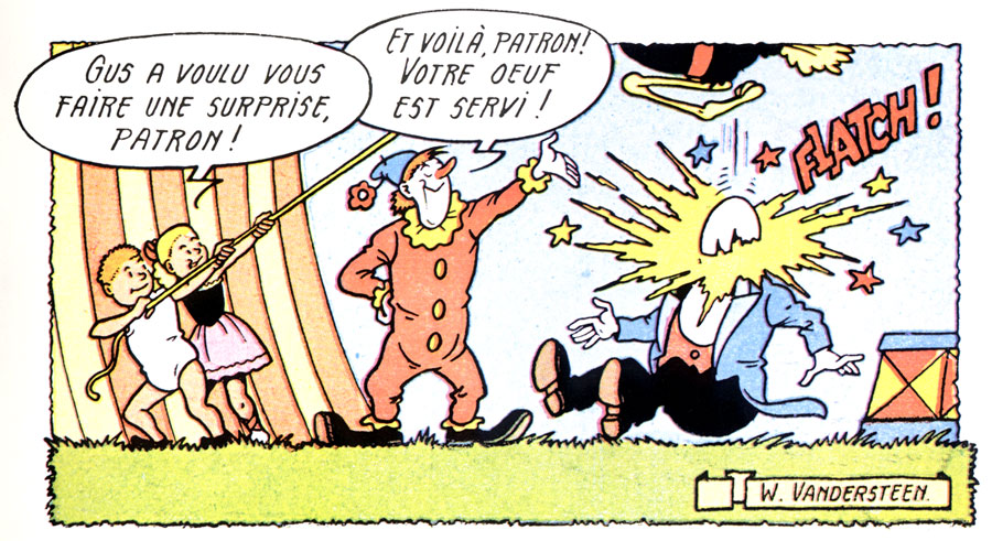 When 'De Vrolijke Bengels' had run its course, Vandersteen created a new gag comic for Ons Volkske titled 'Het Plezante Circus' ("The Joyful Circus"), which ran between 9 September 1954 and 10 April 1958. The feature also appeared in French as 'Le Cirque Zim-Boum'. Set in a circus, the comic stars two children, Jefke the acrobat and Mieke the dancer, as well as Gust the clown and Karlo the magician. The misanthropic worker Bros serves as the antagonist. In turn replacing 'Het Plezante Circus', Vandersteen created 'De Lustige Zwervers', which ran in Ons Volkske from 17 April 1958 until 11 August 1960. Karel Boumans and Eduard De Rop were regular assistants on this feature. The gags center around two tramps, Job and Bob, who are shadowed by a secret agent, Agent 17, who wants to arrest them for vagrancy. Though short-lived, much of the concept was an embryonic version of Vandersteen's future series 'Robert en Bertrand' (1972-1992).