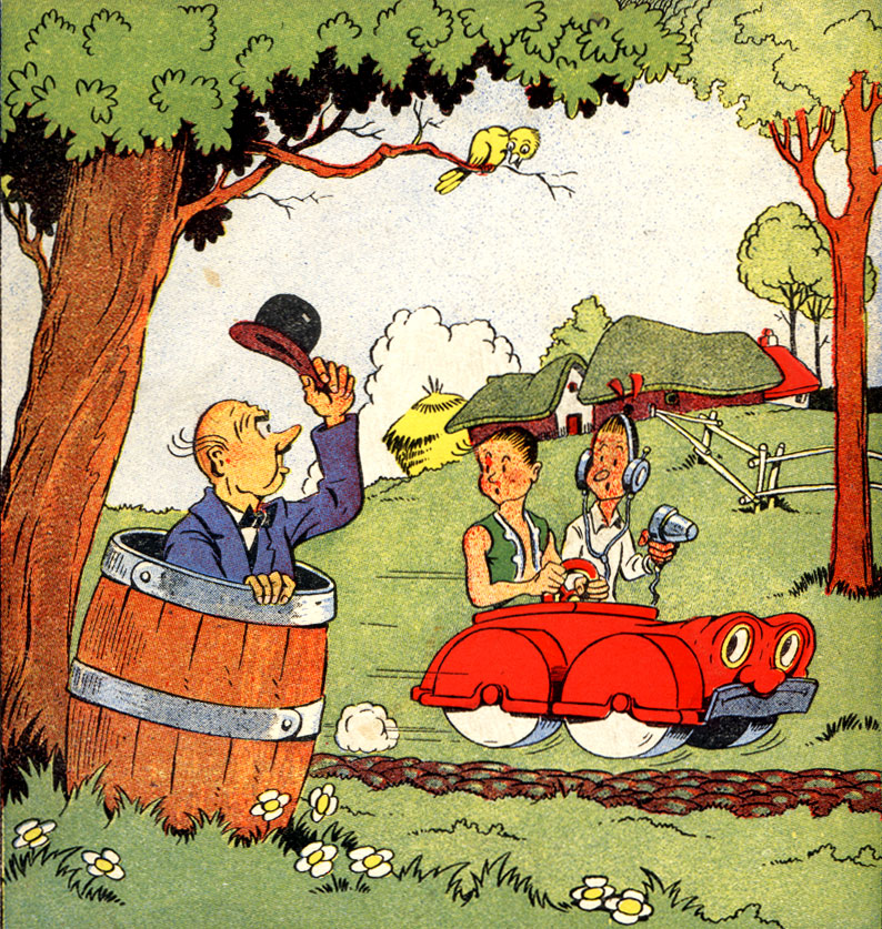 In addition to Suske, the episode 'Op Het Eiland Amoras' also introduced the absent-minded professor Barabas. He was originally an obese stutterer, but he soon lost those traits. Barabas' inventions often set the plot in motion. In 'Op Het Eiland Amoras', his supersonic helicopter, the Gyronef, is introduced, while in 'De Sprietatoom' (1946), he constructs an anthropomorphic car named Vitamitje. His most famous invention, a time machine, was introduced in 'De Tuf-Tuf Club' (1952), allowing many adventures set in historical eras. These three Barabas inventions returned in many subsequent stories.