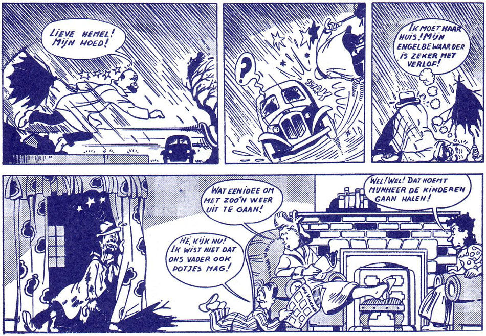 For Ons Volkske, the children's supplement of Ons Volk, Vandersteen created the classic gag comic 'De Vrolijke Bengels' ("The Cheerful Rascals", 1946-1954), which debuted on 1 August 1946. Gag comics about naughty children have always been popular in Belgium, with Rudolph Dirks' 'Katzenjammer Kids', Hergé's 'Quick & Flupke' and Pink's 'Filipke en de Rakkers' as important predecessors. The jolly rascals in Vandersteen's comic are the boy genius Poliet, who talks in rhyme, the girl Vlooike and the stone deaf twins Pontius and Pilatus. Originally, there was also a chubby kid named Patatje, but he was dropped shortly afterwards. The kids often combat Tieter, a bossy and stupid police officer, but have a common enemy in the mean prankster Job. Another recurring character is Mie Pladijs, an elderly woman whose cakes are frequently robbed by Job.