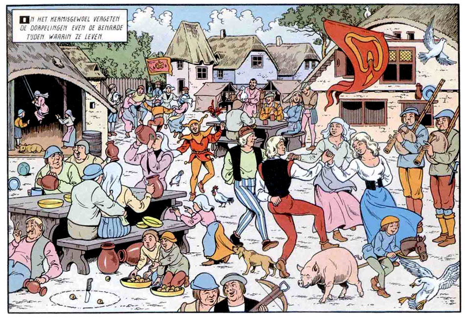 The 'Suske en Wiske' series also thrived on recognizability. The backgrounds, characters, dialect-driven dialogues and ironic sense of comedy are all unmistakably Flemish. Many characters are based on local folklore, such as Lange Wapper and Kludde in 'De Zwarte Madam' (1948) and the Buckrider demons in 'De Bokkenrijders' (1949). Other stories are set in national history, with the main cast meeting people like Gaul chieftain Ambiorix, the 16th-century rebels 'De Geuzen' and painter Pieter Bruegel. During the first seven years of the franchise, stories made references to current events and politics, like the bombing of the Yser Tower (1946) and the Royal Question (1945-1990) whether Belgian King Leopold III was allowed to return to the throne after the war. Since many of these jokes were quickly dated and sometimes controversial, Vandersteen eventually dropped them in favor of more timeless comedy. In general, readers responded enthusiastically to this regional atmosphere, especially since no comics before had found so much inspiration in Flemish culture. In fact, Vandersteen can be credited with familiarizing many historical and folkloric characters in both Flanders and the Netherlands. Setting many storylines in real-life cities, towns and countryside only added to the recognizability.