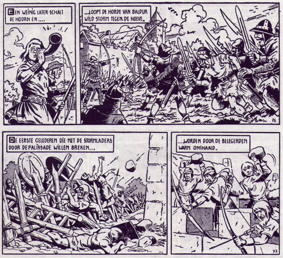 Also in 1972, Willy Vandersteen developed a comic series set in the 16th century, during the Spanish occupation of Flanders. The main characters are slightly based on 'Tijl Uilenspiegel', namely a young hero (Hannes), his sweetheart (Veerle) and an chubby comedic sidekick (Tamme), all expies for Tijl, Nele and Lamme Goedzak. The original comic went as far as 11 pages, before Vandersteen abandoned the project. Thirteen years later, he returned to his original idea and redesigned the characters. The end result was 'De Geuzen' (1985-1990), which started out as a humorous series. From the fifth album on, both the artwork and the general tone became more serious. Vandersteen felt very attached to 'De Geuzen' and spent a lot of time on historical research. As a personal tribute, each book publication reproduced an engraving by Pieter Bruegel. The love scenes between Hannes and Veerle were also far more sensual - though still chaste - in comparison with his other series. Vandersteen put his soul into this passion project and didn't seek serialization with editorial interference. Instead, all stories appeared instantly in book form. Vandersteen also insisted on having no assistance and didn't allow anyone to continue the series after his death. However, as his health deteriorated, some of his artists occasionally filled in for him, most notably inker Eugeen Goossens.