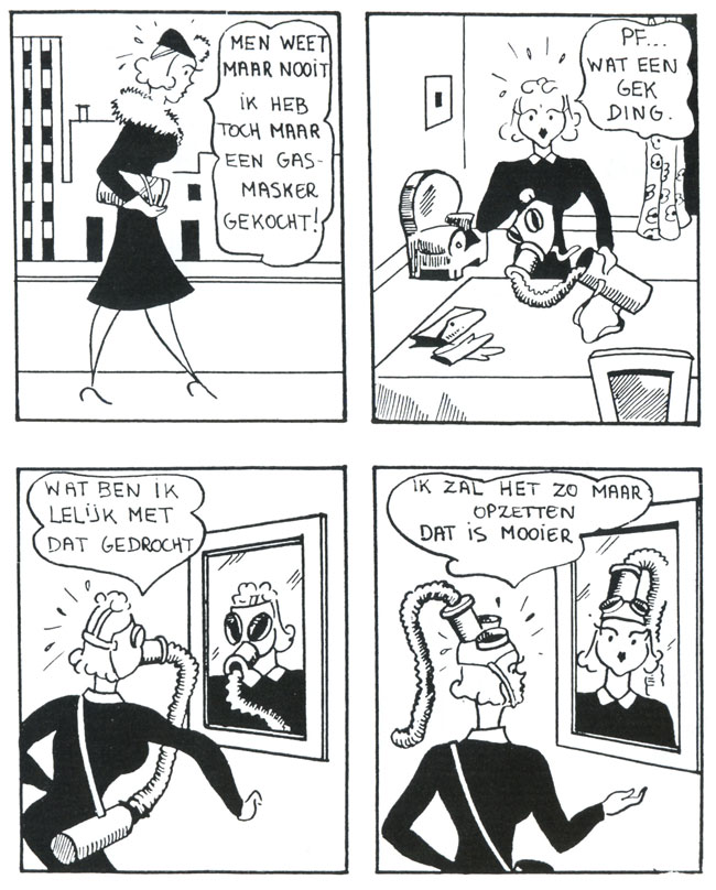 Early wartime strip of 'Kitty Inno'. Kitty dislikes how she looks with a gas mask, until she uses it as a hat.