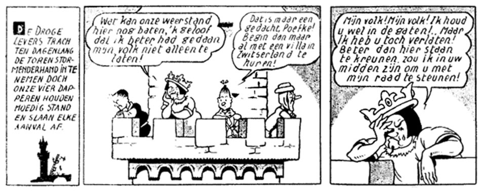 Political satire in the original publication of 'De Koning Drinkt' (1948), referring to the Royal Question. The king has fled and feels guilty for leaving his people behind. Wiske advises him to "hire a villa in Switzerland", in reference to Belgian King Leopold III who, after World War II, also lived in exile in Switzerland for a few years.