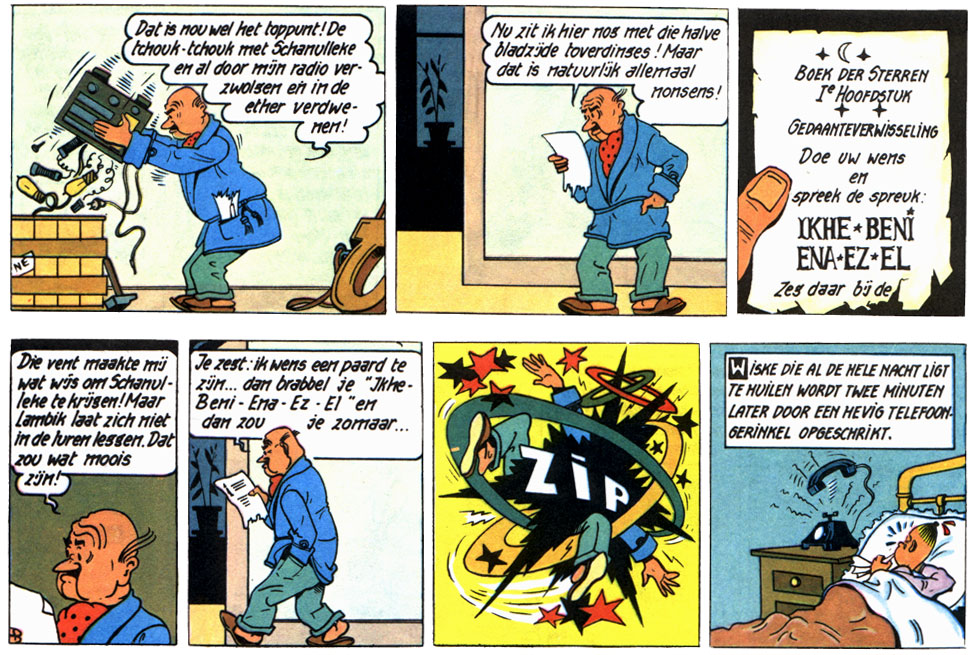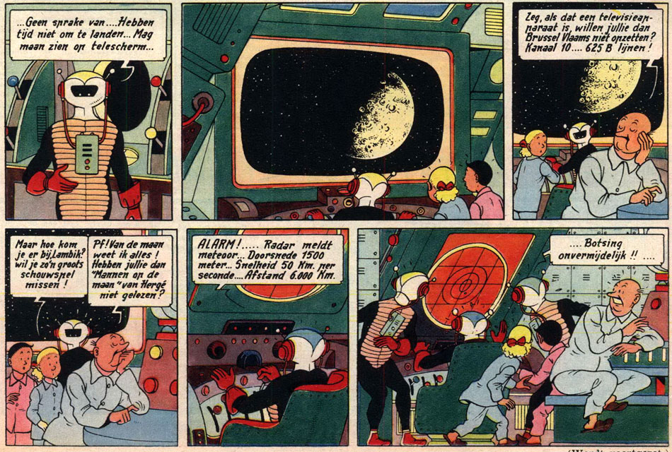 "Deleted scene" from 'De Gezanten van Mars', in which Lambik is uninterested in landing on the moon, because he read Hergé's 'Tintin' story 'Explorers on the Moon' (Kuifje #39, 29 September 1955).