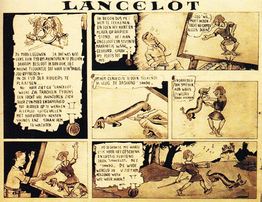 In May 1943, Vandersteen joined the bilingual comic magazine Bravo!, where his fellow artists E.P. Jacobs and Jean Dratz gave him a lot of professional advice. For this magazine, he created 'Tori De Holbewoner' (1943-1944), basically a younger version of his earlier caveman creation Tor. A month later, Bravo! ran his humorous pirate comic, 'Simbat de Zeerover' (1943-1944), of which the protagonist can be seen as a prototypical version of his future comic hero Lambik. Vandersteen's final comic strip for Bravo!, 'Lancelot' (November 1945 - 26 September 1946), was a gag comic about a knight and his dachshund Sando.