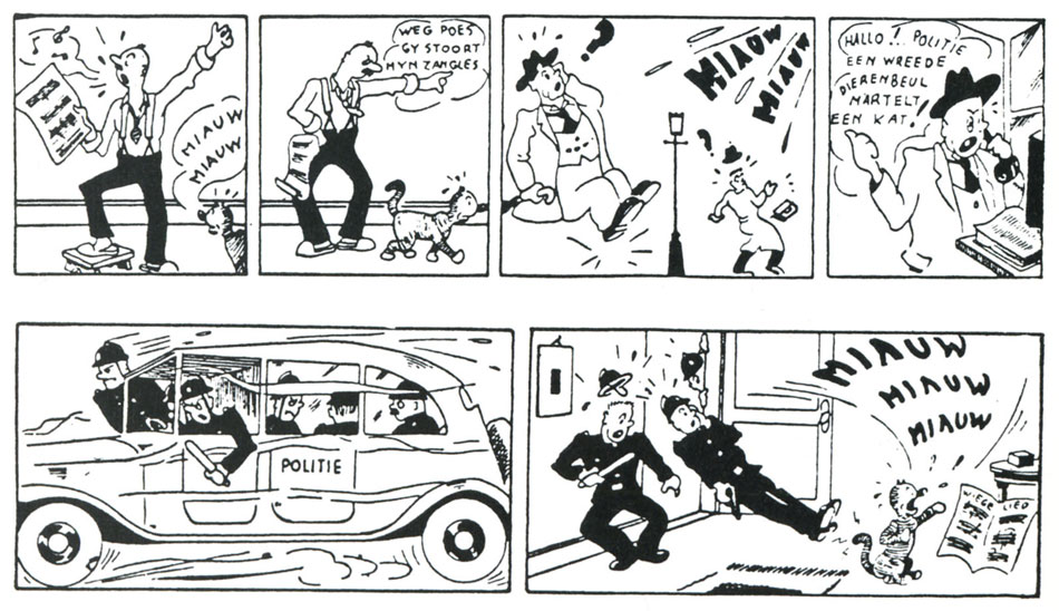 Vandersteen's earliest comic, 'Pinneken en Dik' (1939), never saw publication, so he was off to a bad start. World War II changed his opportunities. As the Nazi oppressor banned all import of U.S. and British comics in occupied Belgium, there was suddenly a higher demand for locally produced material. Willy Vandersteen made his professional debut with the comic feature 'Kitty Inno' (1940-1942) in Entre Nous, the monthly staff magazine of the Innovation stores. This gag comic about a young woman mostly told jokes related to the store and war-time reality of buying products with food stamps. When Vandersteen left his job at Innovation in 1942, 'Kitty Inno' was continued by other, anonymous, artists until 1945. On 19 March 1941, his first newspaper comic appeared in De Dag, 'Tor, De Holbewoner' (1941-1942). It also ran in French as 'Herculin' in the Brussels weekly Mon Copain. Between 11 June and 3 September 1941, these pantomime gags about a bearded caveman were temporarily moved to De Dag's children's supplement Wonderland, before being interrupted for a month. De Dag then brought back the series on 8 October until the final episode appeared on 28 January 1942. When asked to replace Wonderland's run of the American comic 'Cicero's Cat' by Bud Fisher (under the title 'Barabas', Vandersteen created 'De Lollige Avonturen van Pudifar' (26 March-21 May 1941). A couple of weeks later, Vandersteen also created a spin-off about Pudifar's son, 'Barabitje'. During this period he signed all his comics with "Wil".