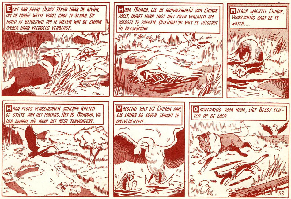 Inspired by the popularity of the 'Lassie' TV series, Willy Vandersteen and his co-worker Karel Verschuere created a more successful blend of adventure and didactics: 'Bessy'. Vandersteen asked MGM for permission to create a comic strip around Lassie and even bought a collie dog for inspiration. However, the studio insisted on exact adaptations, so in the end, Vandersteen decided to come up with his own series. Just like Lassie, Bessy is a female collie, but all action is set in the Far West. Bessy and her owner Andy travel through the prairie with occasional educational intermezzos. Whenever the duo encounters an animal or a plant, captions give readers a small biology lesson. 'Bessy' took off on 24 December 1952 in La Libre Belgique, before making its Dutch-language debut in the weekly Ons Volk (17 December 1953). Starting in 1959, the adventures also ran in the newspapers Het Belang van Limburg and De Gazet van Antwerpen. One story, 'De Gevangene van de Witchinoks', also appeared in De Standaard. In the Netherlands, 'Bessy' ran in the Catholic weekly Katholieke Illustratie (1955-1966), while newspaper De Telegraaf published two stories, 'De Strijdbijl' en 'De Verdwaalden' in 1960 and 1961.