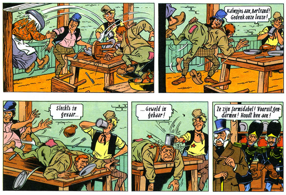 When Vandersteen retired from the 'Suske en Wiske' comic in 1972, he had more time for a new ambitious project. Since childhood, he was a huge fan of Raf Verhulst's 'Robert en Bertrand', about two happy-go-lucky tramps. In the late 19th and early 20th century, their adventures were the subject of many theatrical plays and youth novels. Vandersteen cherished a lifelong dream to make a comic about them, set in the 19th century. In his version, the blond-haired Robert and black-haired Bertrand are scoundrels too, but fight injustice wherever they go. Their motto is "Slechts in 't gevaar, geweld in 't gebaar." ("Only when in danger, violence is allowed."). During their journeys, they adopt the young Moldavian prince Joeki (modeled after Vandersteen himself as a child). The trio is constantly stalked by secret agent Nr. 17, who wants to jail them for vagrancy. The 'Robert en Bertrand' comic ran in De Standaard from 30 November 1972 until 6 July 1992. While some regard it as one of Vandersteen's finest achievements, the series was never a huge hit with the general audiences. Starting in 1985, the scripts were written by Marck Meul, with Ron Van Riet providing the artwork. Other Studio Vandersteen workers who contributed were Eugeen Goossens, Jeff Broeckx (inking), Ann Van De Velde (inking), Marie-Claire De Cock (coloring), Eduard De Rop and his son Eric.