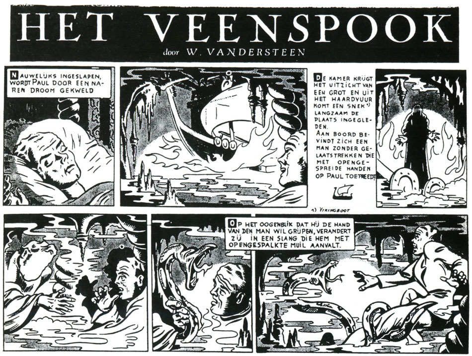 Meanwhile, the newspaper Ons Volk ran various realistic one-shot comics by Vandersteen. 'Marscommando's op Aarde' ("Martian Commandos on Earth", 14 July 1946 - 12 January 1947) was a science fiction story about alien invasions from Mars. The atmospheric ghost story 'Het Veenspook' ("The Peat Ghost", 19 January - 29 June 1947) ran in Ons Volk and its follow-up Overal. The underwater treasure hunt story 'Het Verzonken Rijk' ("The Sunken Empire") could be read between 6 July and 9 November 1947. A couple of years before Hergé, Vandersteen already made a moon travel comic with 'De Eerste Maanraket' ("The First Moon Rocket", 16 November 1947 - 31 May 1948). The exotic thriller 'De Staalblauwe Boeddha' ("The Steel Blue Buddha", 6 June 1948 - 16 January 1949) was set in China and mostly drawn by Vandersteen's assistant Maurice Tillieux. Vandersteen returned to horror with the werewolf story 'De Weerwolf' (26 June 1949 - 15 January 1950), while 'Het Gouden Masker' ("The Golden Mask", 11 June - 26 November 1950) took place in darkest Africa. A rare humorous story for Ons Volk was 'Tanjar de Viking' (22 January - 4 June 1950), about a bluestone Viking statue that came to life, like the Golem. Vandersteen's final contribution was an adaptation of 'Willem Tell' ('William Tell', 19 July - 20 September 1951). Vandersteen created the one-shot comic 'De Pantoscaaf' ('The Pantoscave', March 1949 - July 1950) in De Knape, a magazine for Catholic students, which also published it in book format.