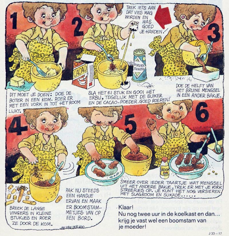 Van der Voo eventually joined Jan Kruis in his own studio, creating advertising comics and illustrations under the banner "Jan Kruis Producties". Joining the team were the artists Wim Giesbersand Martin Lodewijk. Notable productions were a great many advertising strips, mostly for candy brands, that appeared in comic magazines like Donald Duck and Pep. Starting in 1962 - during their Van Maanen days - and lasting well into the 1970s, their creations included 'Max' for Mars candy bars, 'Tim' for Treets, 'Bounty Eiland' for Bounty, 'Koos' for Kodak, 'Mieke en Wouter' for Milky Way, 'Sjokoprins' for De Beukelaer and 'De Broodversierders' for De Ruijter; all written by Kruis and drawn by Van der Voo.