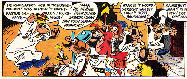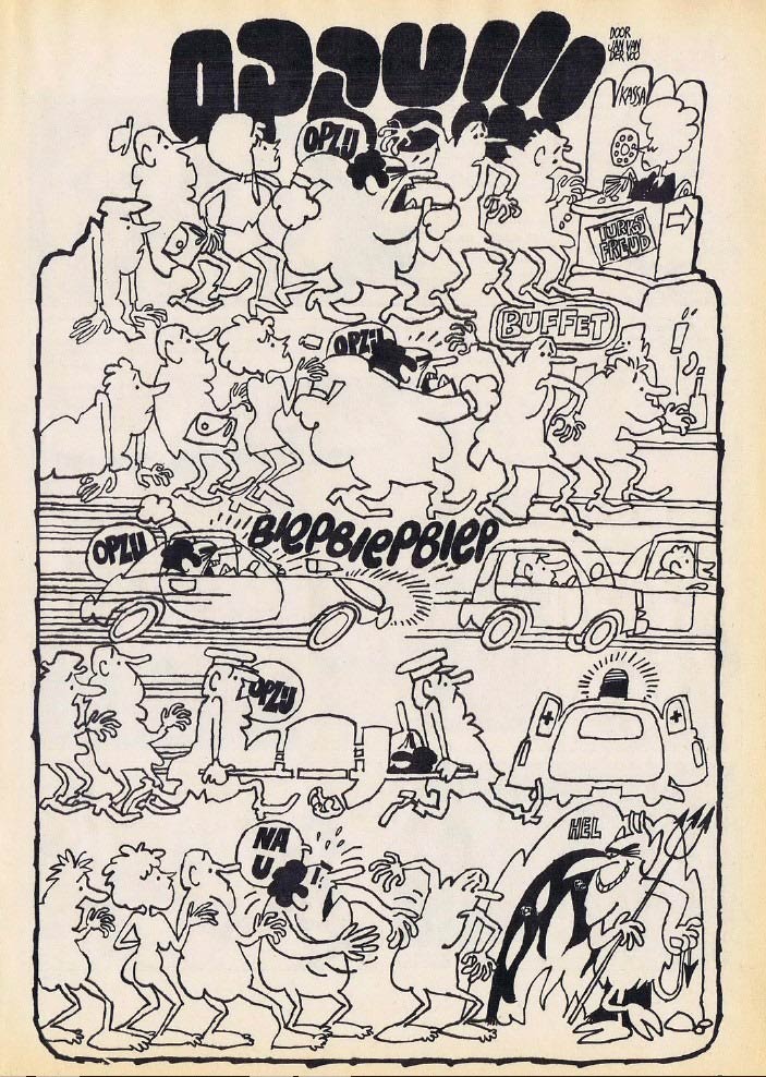 The collaboration between Jan van der Voo and Jan Kruis lasted until the mid-1970s, when the Van der Voo family moved to Zweelo, a town in the Drenthe countryside. One of their final joint creations were the daydreams of 'Moeps Pepernoot' (1974), a comic feature appearing in the early issues of the gossip magazine Story - with additional scriptwork by Patty Klein. The two men remained close friends, especially when the Kruis family moved east as well. Van der Voo's son Jeroen stood model for the character Jeroentje, the quick-witted neighbor kid in Kruis' signature comic 'Jan, Jans en de Kinderen'. For Jan Kruis' 2007 illustrated adaptation of Multatuli's 'Woutertje Pieterse', Jan der Voo provided the illustrations for a dream sequence.