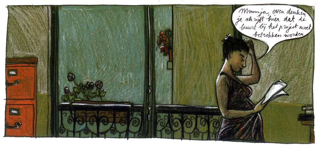 Judith Vanistendael at first shared a studio space with architect Barbara Roosen in Molenbeek's former Belle-Vue brewery, where they were eventually joined by Wauter Mannaert and Eva Hilhorst. By the end of 2012, the group moved to a larger studio in Schaarbeek. They nicknamed themselves "De Geslepen Potloden" ("The Sharpened Pencils") and were quickly joined by other artists, including five French-language colleagues from the L'Employé du Moi publishing label. Vanistendael eventually settled in her own atelier at the border of Molenbeek's rough Heyvaertwijk. The rapidly changing quarter is known for its large African population, and has been the subject of a comics documentation project initiated by Axel Claes since late 2016. Vanistendael and Jeroen Janssen participated, and spent an afternoon sketching the local population. Their report was published in Stripgids #2 in December 2017.