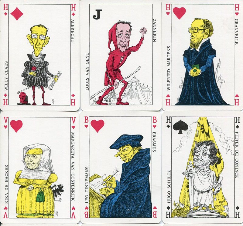 'Commedia dell'Carte' playing cards (1977). Various 20th-century Belgian politicians portray famous people from Belgium's history. Willy Claes is cast as Archduke Albert VII of Austria, Louis van Geyt as Nicolaas Zannekin, Wilfried Martens as Antoine Perrenot de Granvelle, Rika De Backer as Margaret of Austria, Leo Tindemans as Desiderius Erasmus and Hugo Schiltz as Pieter De Coninck.