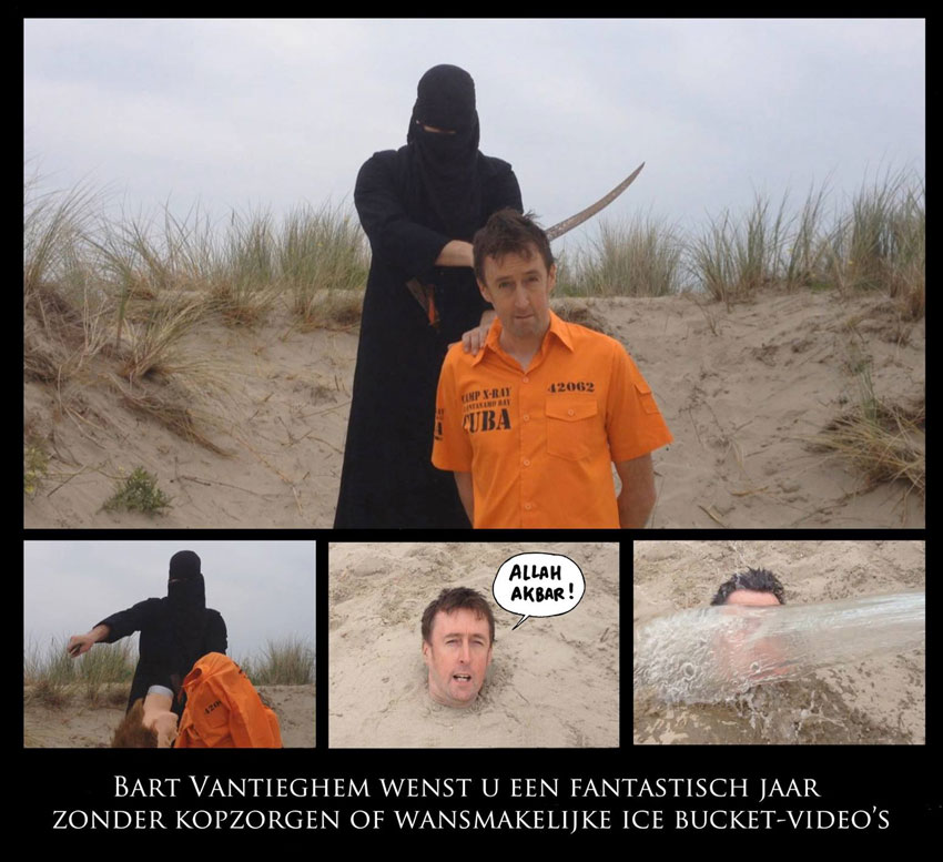 On 1 January 2015, Vantieghem posted a photo comic, depicting himself being beheaded by a man dressed as a Muslim terrorist. The snapshots were taken in the dunes of a local beach, to evoke a desert atmosphere. To make it look as if he was decapitated, Vantieghem was buried up to his shoulders in sand, after which he was splashed with water. The gag was titled 'IS Bucket Challenge', referencing the Muslim terrorist group IS, notorious for their decapitations of hostages, and the social media 'ICE bucket challenge' hype, where people have a bucket of cold water poured over them. The comic quickly went viral and caused controversy. However, comedian Alex Agnew felt it was a good offensive joke, since it actually had a point to make, directed at IS terrorists.