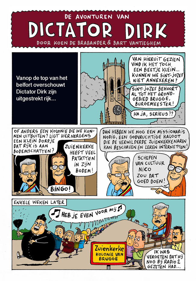 In 2005, Koen De Brabander contacted Vantieghem after having bought a cartoon book by him. He suggested working together, marking the first time Vantieghem collaborated with a scriptwriter. Throughout the decades, they have made several gag comics about local politics in Bruges. From the start, they deliberately decided to only focus on politicians who are part of the local municipality, not just any Flemish politician. Their first gag series was 'De Avonturen van Patrick & Yves' (2005-2012), depicting Christian-democratic mayor Patrick Moenaert and Yves Roose, alderman of Culture, as respectively a tyrant and a drunk sidekick. Episodes were syndicated weekly on the now-defunct satirical website the Moon Art Gallery and later in Het Brugsch Handelsblad, which is part of the regional newspaper Krant van West-Vlaanderen. In 2009 and 2010, two compilation albums were published by Die Keure. After a while, De Brabander grew a bit tired of the concept, which, at the time, was still limited to just a three-to-four panel format, so Vantieghem continued it on his own.