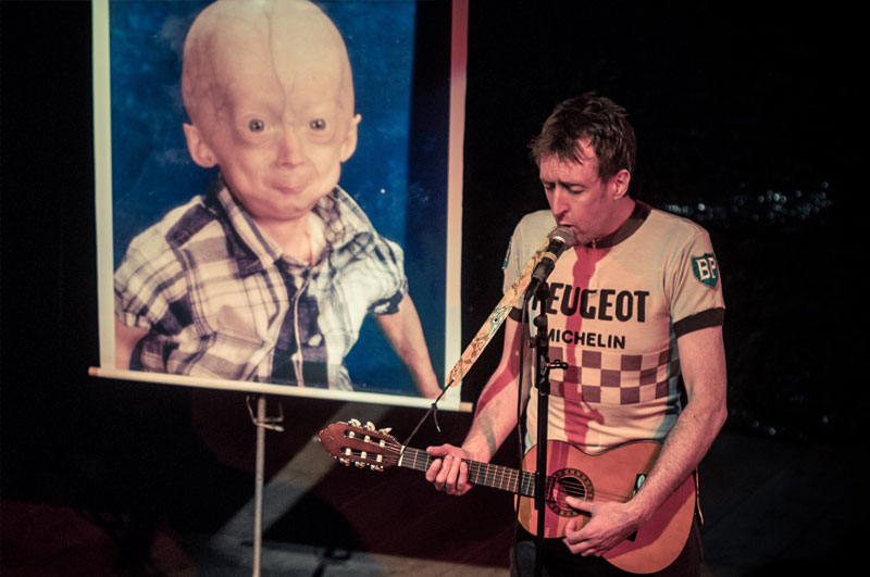 Bart Vantieghem in 2015 during one of his stand-up comedy acts. The photo depicts a real-life child with the illness progeria (which causes children to age far more rapidly than normal). Interviewed by the Cultural Center of Bruges, Vantieghem explained: "I tell the audience that my son has progeria, which scared me so much that I dropped him in a forest for others to find. I then show a gigantic photo of a real-life child with progeria, so confrontational that you virtually lose half of the audience. But then I add that the boy aged so quickly that he was able to bike back home from the forest and still annoys him with his constant nagging about the war and how everything used to be better in the past. After this joke, I win back my audience for about 90 percent."
