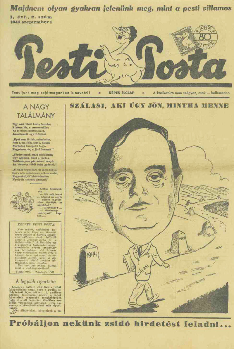 On the cover of the second issue of Pesti Posta (1 September 1944), Kálmán spoofed fascist leader Ferenc Szálasi, who was at that time not appointed Prime Minister yet. The caption read "Szálasi, who comes as if he were going".