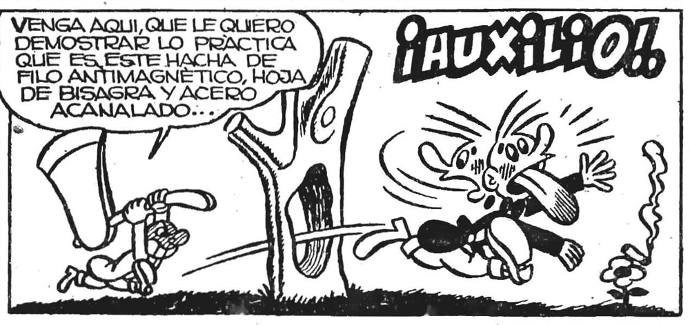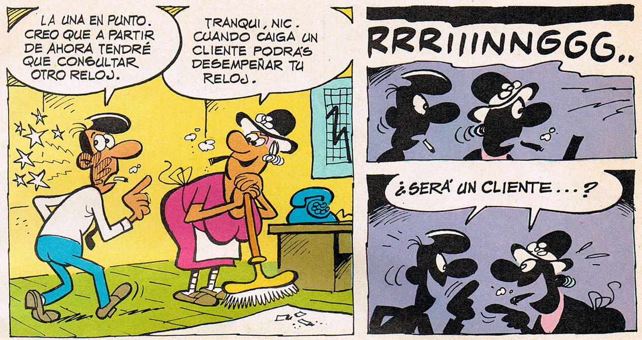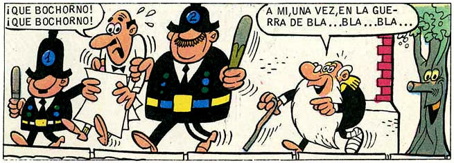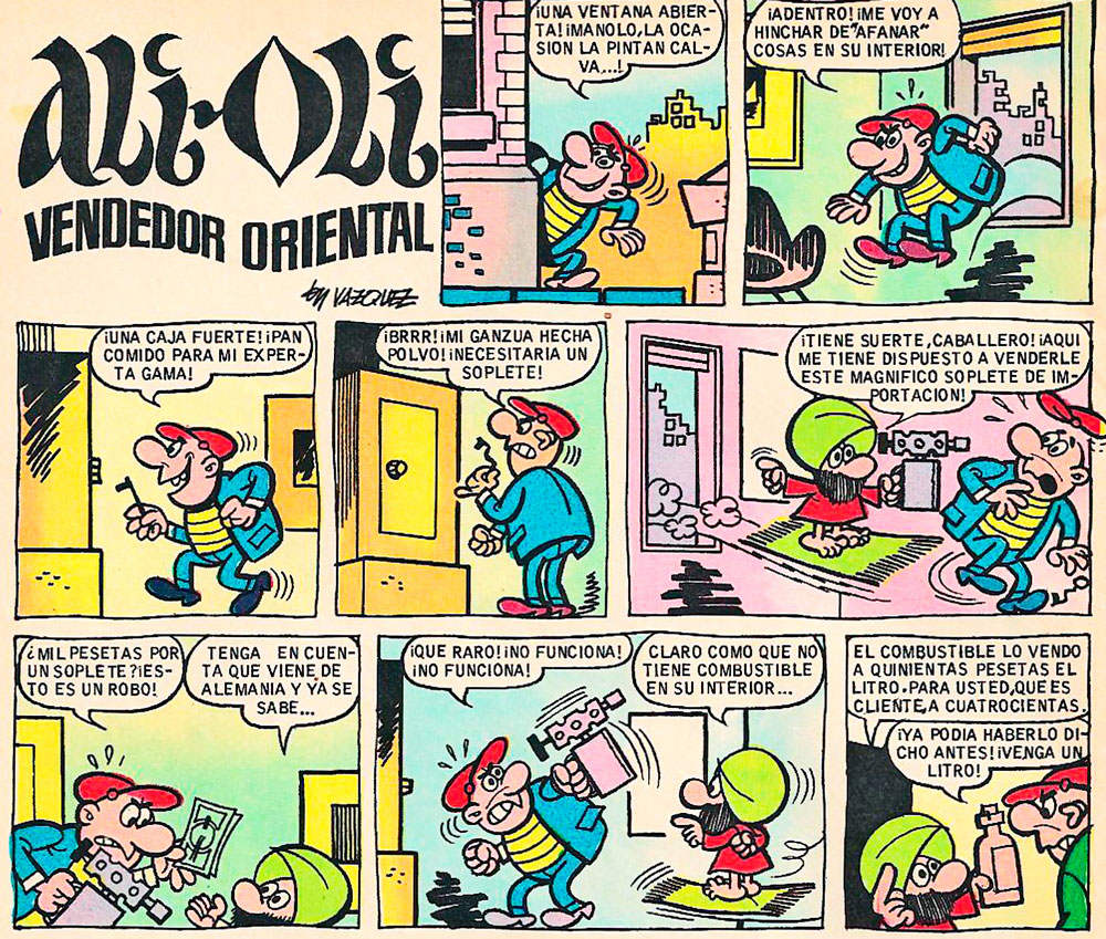 In Bruguera's new adventure-themed magazine Bravo, Vázquez published the series 'La Banda del Barón, Asuntos de Precisión' (1968-1969). 'Ali-Oli, Vendedor Oriental' (Tío Vivo, 1968) was about a stereotypical Arab salesman, while 'El Inspector O'Jal' (El DDT, 1968-1978) was a surreal parody of the detective genre in riddle comics format. For Bruguera's luxury comic magazine Gran Pulgarcito, Vázquez created the elderly 'Don Polillo' (1969-1971), the extremely lucky 'Feliciano' (1969, which also had a role for Vázquez himself as a villain) and 'La Abuelita Paz' (1969), an elderly lady with good intentions which end in disaster. In 1970, he added 'Rufufú' to this list. By this time, Vázquez' lifestyle caused such an irregular supply of pages, that the publisher had to assign Francisco Torá and the studio of Blás Sanchis to make new episodes.