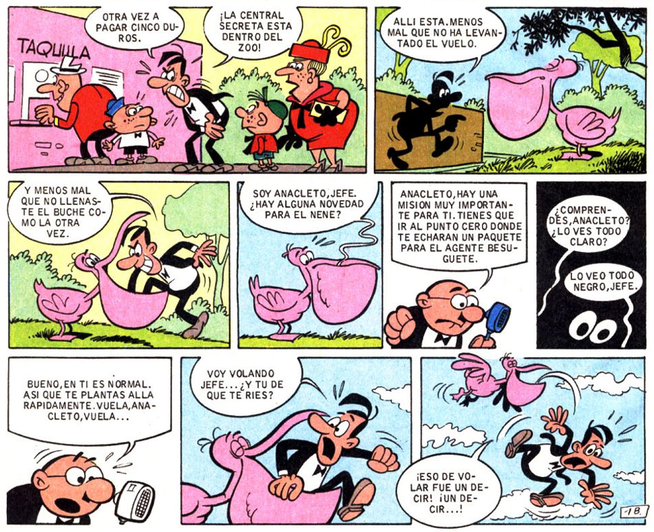 One of Vázquez's major creations of this era was the secret agent parody 'Anacleto, agente secreto' (1964), who debuted in issue #1753 of Pulgarcito. Contrary to popular belief, Vázquez stated he didn't base the series on the 'James Bond' franchise, but instead on the American TV series 'Get Smart'. In every episode, Anacleto is sent on a secret mission by his boss, with whom he has a troubled relationship. In general, he usually has to operate on his own. Most of his missions take place in an urban setting, but Anacleto is often sent to the Gobi desert as well, where the poor spy is constantly troubled by mirages. The hero also regularly climbs steep mountains, which in the end turn out to have an elevator. Whenever there is water involved, Anacleto is chased by a shark. Recurring villains in the series are Professor Boro and... the author himself, referred to as "The Evil Vázquez".