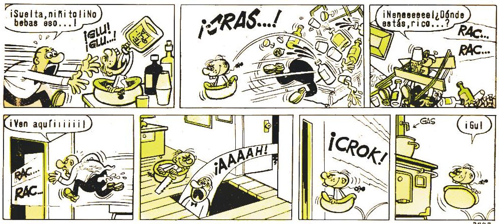 Throughout the next two decades, Vázquez introduced even more new characters in Bruguera's many magazines, now including Pulgarcito, El DDT, Tío Vivo, Din Dan and Gran Pulgarcito. A remarkable creation was 'Angelito', a two-toothed baby in a basket who causes havoc while only uttering the word "¡Gú!". Graphically reminiscent of E.C. Segar's Swee'Pea from 'Thimble Theater', Angelito was originally terrorizing everyone he met, but his later victims were merely thugs or other people who deserved it. The later episodes also featured more fantastic and surreal elements, like trees with humanized eyes and magic pencils which make the figures drawn by Angelito come to life. Throughout the years, 'Angelito' appeared in Pulgarcito, El DDT, Súper Tío Vivo and Mortadelo, and in 1982 his exploits were adapted into an animated short film by Jordi Amorós, called 'Gugú' (1982).