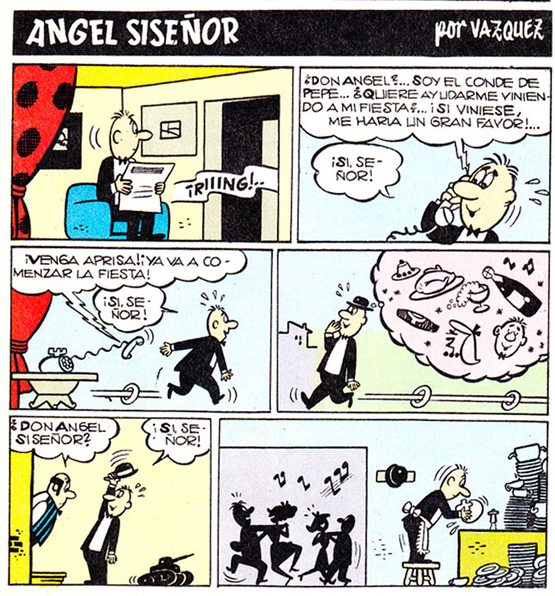 Other creations by Vázquez for El DDT were 'Lopez' (1952) and 'Ángel Siseñor' (1953-1964). Like Grandpa Cebolleta, Ángel also received an iconic status in Spanish society. The polite man answers "Yes, sir" to every request he receives, no matter how outlandish it is. As such, the character's name became the colloquial phrase for a submissive and accommodating person.