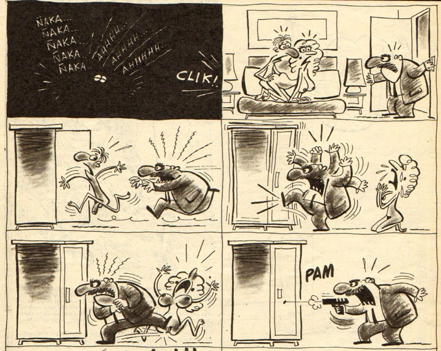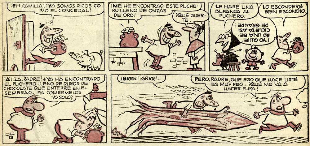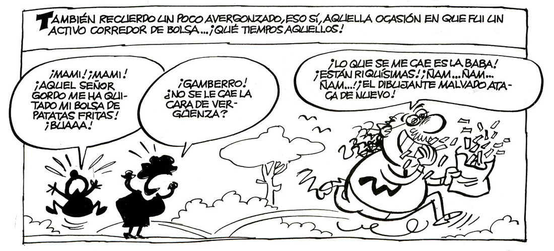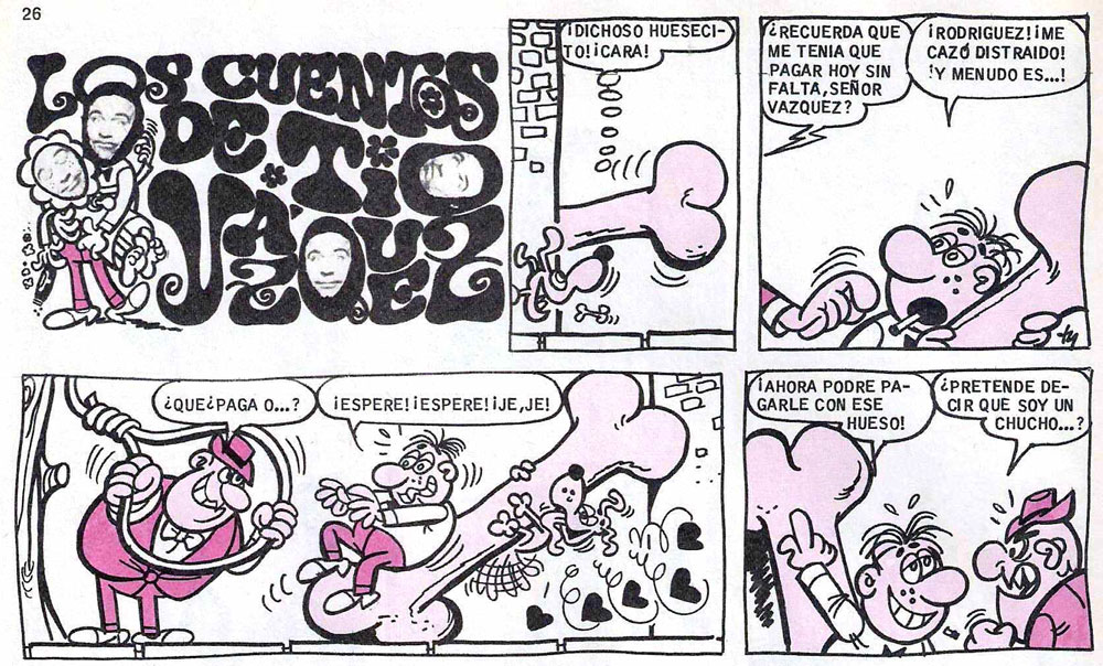As his appearance as the villain in 'Anacleto' proves, the author was not shy from cultivating his own reputation. Already in issue #5 of Can Can, Vázquez published the comic strip 'El Gran Vázquez' (1958), as part of his series 'La Historia ésa, vista por Hollywood'. It portrayed the cartoonist as a sharp-dressed delinquent in constant flight from his creditors, mainly consisting of tailors. The depiction was in fact not far from the truth, as Vázquez was notorious for his lack of discipline and constant need of money. Even his editors at Bruguera were frequent victims of his scams. Vázquez however appeared proud of his sharp tongue and wit, and made it the backbone of his picaresque semi-autobiographical comics feature 'Los Cuentos de Tío Vázquez' ("The Tales of Uncle Vázquez", 1968-1982), first published in Din Dan, as well as its short-lived follow-up, which appeared as 'Yo, Dibujante al Por Mayor' (1982) in Ediciones Druida's JAuJA and as 'Así es Mi Vida' (1982) in the children's newspaper supplement El Pequeño País.