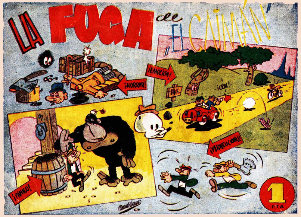 By 1946, Vázquez made his debut with the western comic book 'Macana en el Oeste', published by Hispano Americana de Ediciones. A comic strip with the same characters appeared under the title 'El Matón' in the same publisher's 'Almanaque Juan Centella 1947' (1946) and 'Almanaque Jorge y Fernando 1947' (1946). In the following year, he collaborated with Flechas y Pelayos magazine and its supplement Maravillas, published by the National Delegation of the Youth Front (Frente de Juventudes). Flechas y Pelayos first printed his comic strip 'Jeep' (1947), which Vázquez had created two years earlier, in 1945. Vázquez then contributed the cowboy 'Cápsula' (September 1947) and 'Mr. Lucky' (November 1947), a humor strip about a chap with bow and hat, who doesn't live up to his name. For Publicaciones Ibero-Americanas, Vázquez made a daring one-shot comic book called 'La Fuga de "El Caimán"' (1947), about a dangerous murderer who escapes from prison. The cover of this thrilling, but also comical, adventure comic prominently featured a decapitated man. Between 1949 and 1951, Vázquez was back at Hispano Americana de Ediciones with seven landscape format-shaped booklets for the collection 'Humor de Bolsillo' ("Pocket Humor"), starring little ghosts ('Samba el Fantasma Pequeñito'), genies ('El Mago de la Coz'), cowboys ('Capsula Bill - Aventuras del Oeste') and other comical characters.