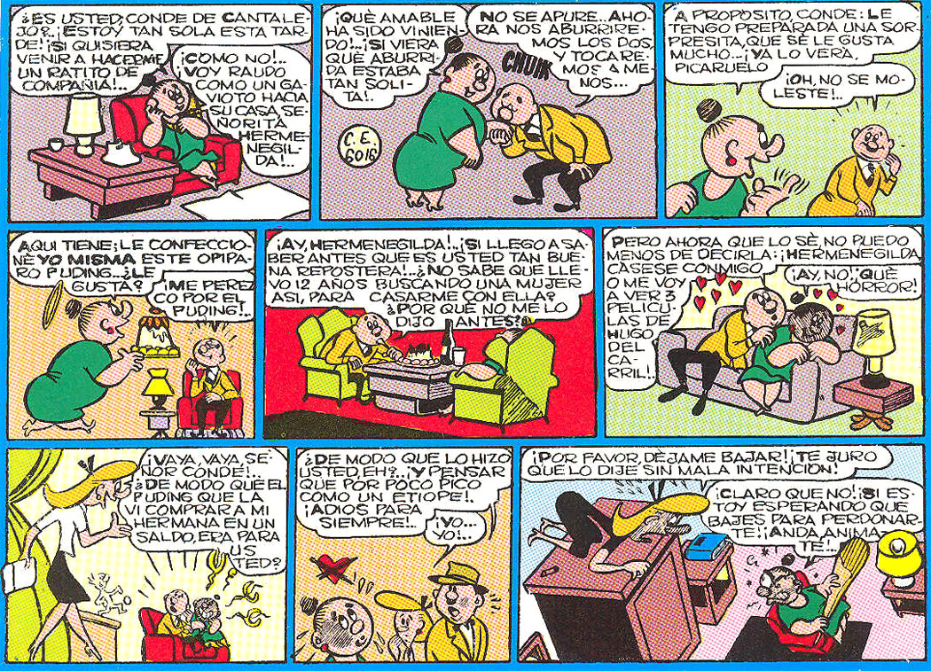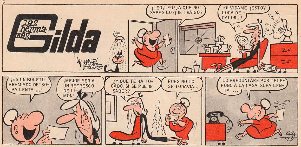 1949 marked the launch of Vázquez's first major series. 'Las Hermanas Gilda' debuted in issue #96 of the post-war Pulgarcito, and continued largely throughout the rest of the author's career in several Bruguera magazines, including Gran Pulgarcito and El DDT. Hermenegilda and Leovigilda Gilda are two not so graceful sisters, who live together despite their differences. Named after the film noir 'Gilda' (1946) and the deadly conflict between the Visigoth rulers Hermenegild and Liuvigild, the two sisters are constantly at odds with each other. The naive and rather silly Herme is of sturdy build and in endless pursuit of a husband. The skeptical and sour Leo in turn is tall and thin, and always frustrating her sister with her sarcastic comments. The series represented the author's sharp criticism of family relations, all illustrated through biting verbal and visual aggression. Censorship after the Decree of 24 June 1955 (about the organization of the children's and youth press) forced the series to tone down a little, while the artwork became more elegant. All in all, 'Las Hermanas Gilda' remained one of Vázquez's signature series, and was featured on a postal stamp in 2001.