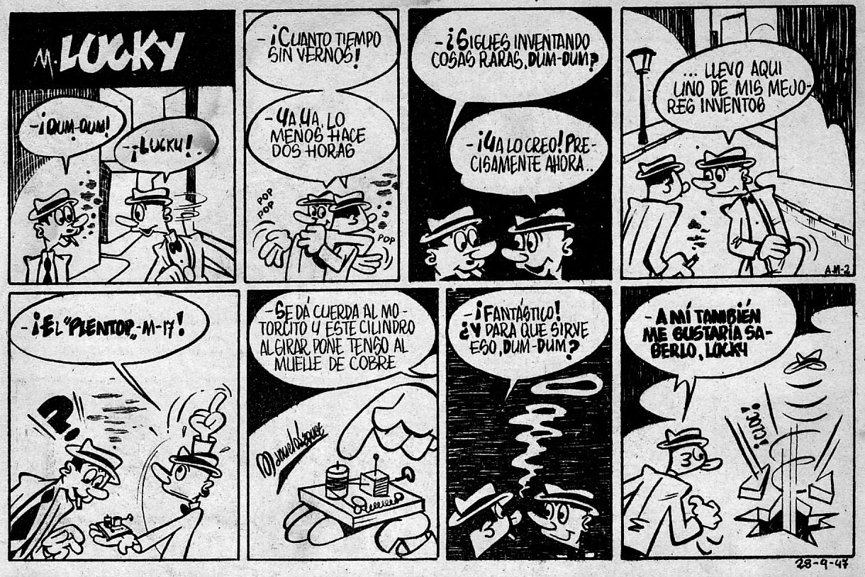 The series about the shy and carefree bachelor 'Heliodoro Hipotenuso' (1948-1950) was the first enduring Vázquez creation, and its humor was characterized by silent film influences, absurdism and the destruction of logic altogether. A graphic masterpiece of this early period was 'La Mansión de los Espectros' (1948). In this serial, Mr. Lucky and Mofeta arrive at an abandoned mansion, where they are subjected to cruel humiliations by a tiny pixie. The artist experimented with effects and compositions to achieve the hallucinatory effect the strange house had on its visitors. He used the same gimmick for his subsequent series 'Él Caserón Diabólico' (1948) and 'El Misterio de la Casa Apolillada'. The series, filled with meta-humor, also starred the cartoonist 'Jimmy Pintamonas', who later got his own feature in Pulgarcito.