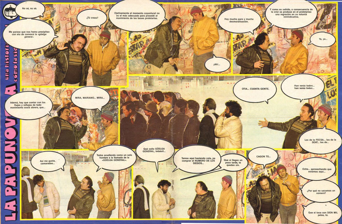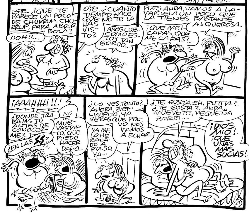 In the late 1970s, Vázquez additionally began submitting work to adult-oriented magazines. As it was generally sexually oriented, he often used the pen name Sappo. The sole issue of Bruguera's "new" Can Can in 1978 featured Vázquez's 'Las Noches locas de Mimí' (1978), 'Mi Calle' (1978) and 'Robín y Sonia' (1978). Notable was 'Don Cornelio Ladilla y su Señora María' (1978) in Ediciones Amaika's El Papus, about a man who always catches his unfaithful wife in the act when arriving home. Amaika also published the satirical magazines El Cuervo and El Puro, to which "Sappo" contributed 'Historias Verdes' (1981), 'A Vista de Sappo' (1982) and 'La Telerisión Y Yo' (1982). By 1980, Vázquez was one of the main "actors" in the photo stories published in El Papus, known as "Papunovelas". To Hara-Kiri, he contributed 'La Saga del Macho Hispánico' ("The Saga of the Hispanic Macho", 1979).