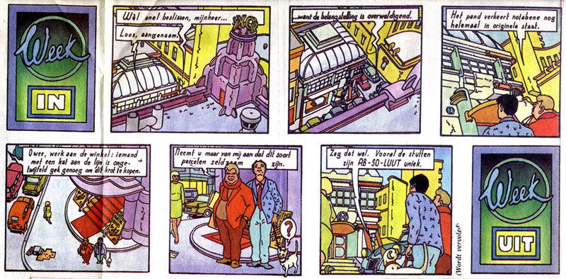 Joost Veerkamp (Josephus Hermannus Veerkamp) was born in Diemen, and studied at the Academy of Fine Arts in Amsterdam. He has worked in several artistic fields, varying from comics to illustration and silkscreens. His work is done in a Clear Line style and shows the artist's passion for architecture. His admiration for Hergé is reflected in the many 'Tintin' pastiches he drew, all with permission of Hergé's estate Moulinsart, by the way. 'Shuttle To The Moon' is a parody of 'Destination Moon' and references the 1986 Challenger disaster, when the space shuttle Challenger exploded mid-air, killing all astronauts inside. 'L'Encre de Chine' is a parody of 'The Blue Lotus' and pays homage to Hergé's masterful use of Chinese ink. The same image was later used on the cover of Harry Thompson's biography of Hergé: 'Tintin: Hergé and his Creation' (1991). 'Het Zwarte Goud' uses the same title and image of 'The Black Gold' to reference the 1991 Gulf War, with U.S. President George Bush Sr. and a captured Saddam Hussein traveling along in the jeep. 'De Scepter van Gorbatsjov' parodies 'King Ottocar's Scepter' and Russian leader Mikhail Gorbachev passing his own scepter to Boris Yeltsin. 'Vlucht Ly 1862' parodies the cover of 'Flight 714' and references the 1992 airplane disaster on the Dutch apartment block in De Bijlmer. 'De Ploert met de Gulden Stralen' spoofs 'The Crab With The Golden Claws' and references the extremely hot summer in the Netherlands during 1994. Veerkamp parodied the same Tintin album with a cover which simultaneously referenced the Camel cigarettes brand. 'Tintin in America' is parodied with 'Cruijffje Mist Amerika', satirizing football trainer Johan Cruijff and the 1994 World Championship Football in the U.S. 'Buikje en de Jihado's' satirizes 'Tintin and the Picaros' and the 2004 murder of film director Theo van Gogh by a muslim extremist, while simultaneously caricaturing islamic critic Ayaan Hirsi Ali too.