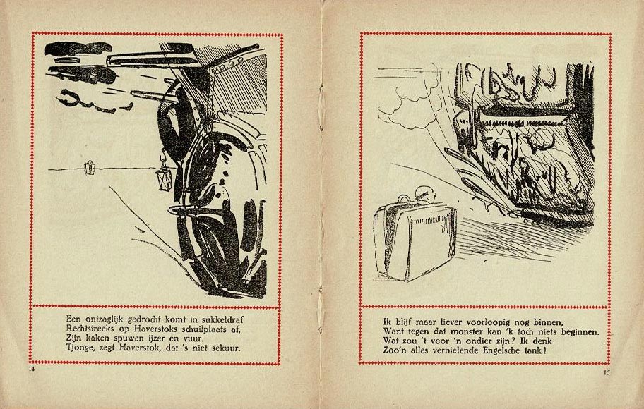 In 1917, Van de Velde was the artist behind the advertising booklet 'Het Avontuur van Haverstok met den Koffer van Verweegen en Kok', by commission of suitcase supplier Verweegen en Kok in the Kalverstraat in Amsterdam. The book features a comic strip about a war correspondent heading for the battlefields. His subsequent adventures in the war zone are testimonials of the durability of his suitcase, which, of course, was supplied by the company concerned. The texts in rhyme were written by J. Siedenburg, a writer from Blaricum. The booklet wasn't the first appearance of mister Haverstok. In 1912, the character had already made its debut in a similar booklet, written and drawn by Ko Doncker.