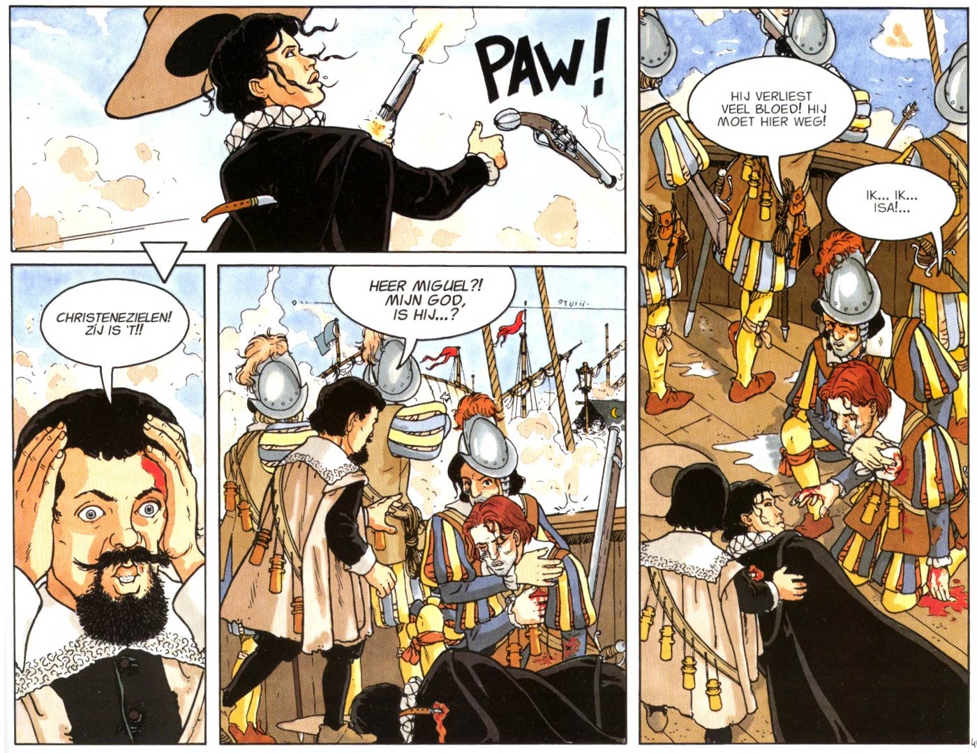 With the 'Masquerouge' series coming to an end, Marco Venanzi began a regular collaboration with writer and fellow artist Michel Pierret. Their first joint creation was 'Hidalgos', a historical fiction about Miguel de Cervantès, the writer of 'Don Quixote'. Two books were published in Glénat's Vécu collection in 2003 and 2007. From a script by Alexis Nolent, Venanzi and Pierret joined art duties on the celebrity comic about soccer player Zinedine Zidane (Casterman, 2005). They additionally worked on several contemporary albums for Casterman by commission of the Alliance of Liberals and Democrats for Europe group, the liberal-centrist political group of the European Parliament. These have included 'Opération Dragon Rouge' (script by Thierry Robberecht, 2006), 'Le Protocole Aïda' (script by Yannick Laude, 2008), 'Tempête Sur la Finance Verte' (script by Alain-Germain Laubry, 2011), 'La Chute de la Dame en Blanc' (script by Yannick Laude, 2013) and 'Complot Contre L'Union' (script by Yannick Laude, 2018).