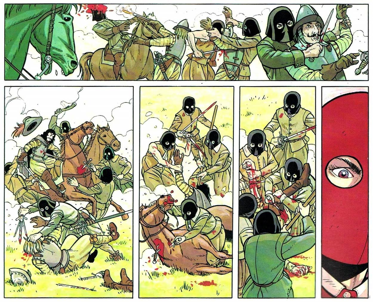 In 1990, Venanzi appeared in Vécu, the magazine with historical comics by Éditions Glénat, drawing the short story 'Heure de la Curée', written by Rodolphe. Two years later, still at Glénat, Venanzi had his professional breakthrough as the new artist of 'Masquerouge', a historical series written by Patrick Cothias about a masked vigilante in 17th-century France. The stories are set against the religious wars that plagued the country during that period. During the early 1980s, the three initial stories of the series had been drawn by André Juillard and were serialized in Pif Gadget magazine (1980-1982) and published in book format by Glénat in 1984. Cothias and Juillard then dropped the series to create 'Les 7 Vies de L'Épervier' (1983-1991) for Circus magazine, a prequel saga set in the same universe. Aimed at a more mature audience, 'Les 7 Vies de l'Épervier' was a landmark in French historical comics for its focus on character-driven plots instead of time periods. The success prompted Cothias to create spin-off series focusing on different characters from the original cycle. This included a relaunch of 'Masquerouge', for which Venanzi was brought in as the artist. Between 1992 and 2004, Venanzi worked with writer Cothias on seven new volumes.