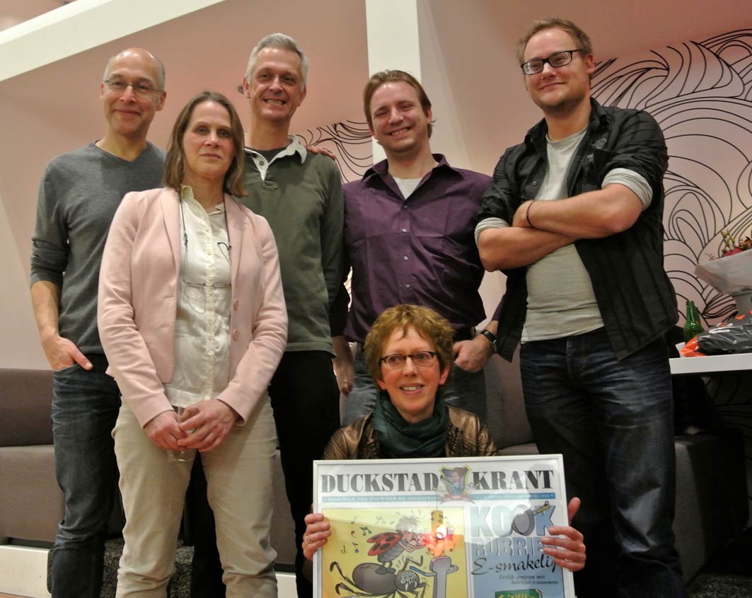 Art team members Frans Hasselaar, Wilma van den Bosch, Michel Nadorp, Jan-Roman Pikula and Viktor Venema (standing) at the farewell party of colorist Jacqueline van Oers (sitting) in 2013.