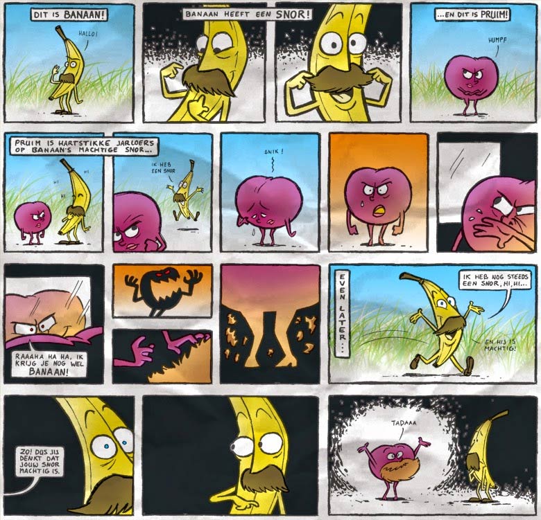 'Snor' (BNS Stripkrant, 2010). Pruim expresses jealousy at Banaan's mustache, until getting a beard herself.
