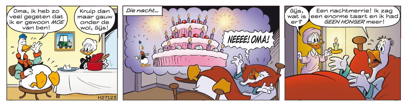 'Gus Goose and Grandma Duck', letterbox comic for Donald Duck #15, 2010. © Disney. Gus Goose has a nightmare in which he sees an enormous cake, but lacks the hunger to eat it.
