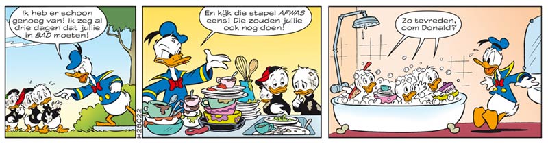 'Donald Duck', comic strip for Donald Duck #19, 2006. © Disney. Translation: "I'm fed up with this. I've been telling you for three days that you should take a bath. And look at that mountain of dishes! You promised to do those too!" - "Happy, Uncle Donald?".