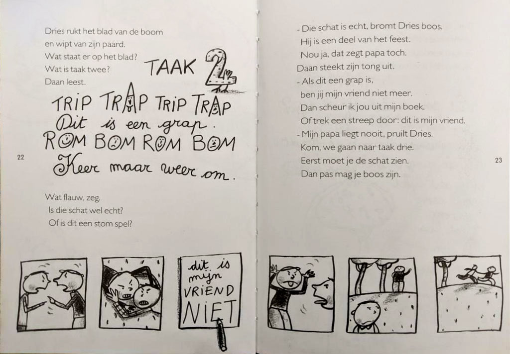 Over the years, Vercruysse also livened up pages for Marita De Sterck ('Boeken Groeien Altijd Door', NCJ, 1991), Dirk Nielandt ('De Boomhutboom', Bakermat, 1999), Hilde Vandermeeren ('Het Groene Licht', 2003), Wim Vromant ('Het Lachje van Sint', De Eenhoorn, 2000), Lydia Verbeeck ('Oostende Enkele Reis', De Eenhoorn, 2002) and Heidi Walleghem ('Het Hamerspel', De Eenhoorn, 2003). One book she provided artwork for - Reina Ollivier's 'De Wraak van Ramona' (2013) - has also been translated into French as 'La Vengeance de Ramona'. Apart from fiction, Vercruysse has also contributed to the non-fiction book 'Basisboek voor een ervaringsgerichte kleuterpraktijk' (CEGO Centrum voor Ervaringsgericht Onderwijs, 1994) by Ferre Laevers and Peter Van Sanden.