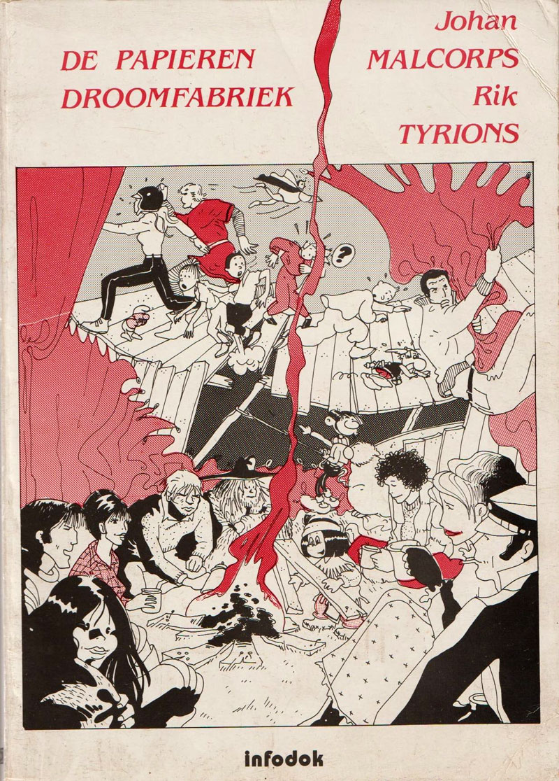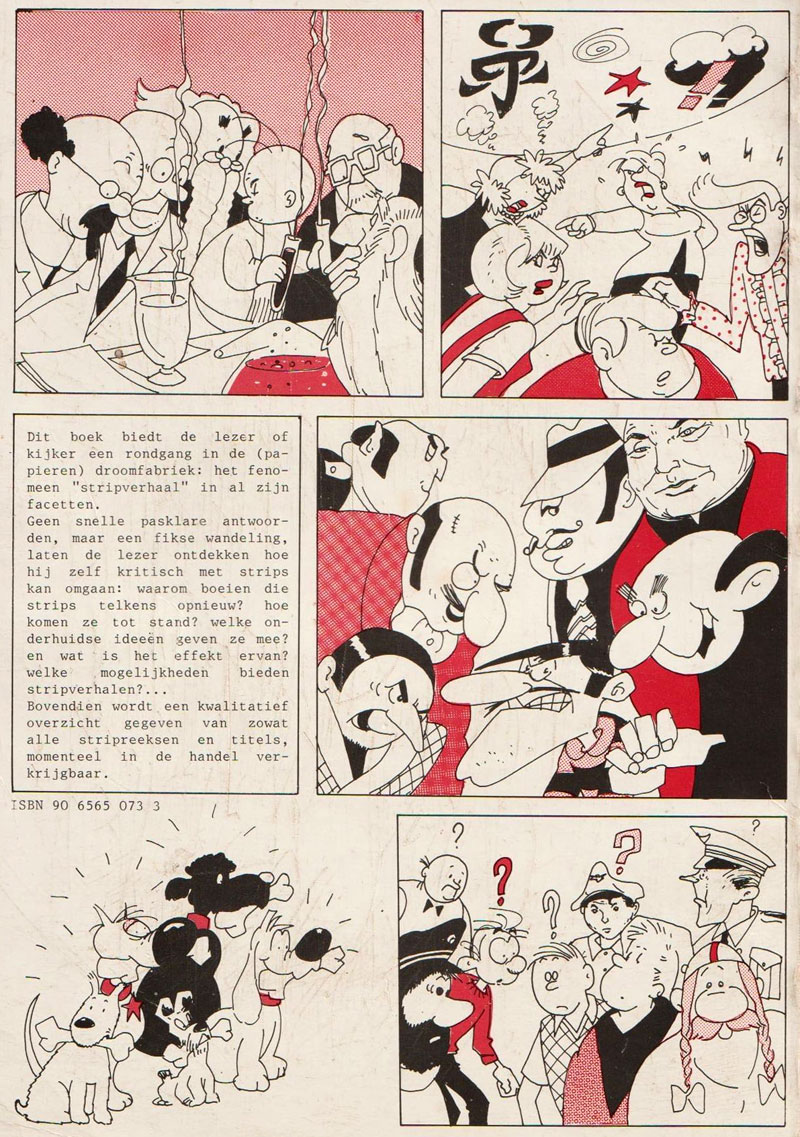 In 1985, Johan Malcorps and Rik Tyrions published 'De Papieren Droomfabriek' ("The Paper Dream Factory", Infodok/Davidsfonds), a book featuring essays about comics. The authors discuss the appeal of comics, how they're made and their creative possibilities. Other chapters are critical analyses of ideological undertones, gender and racial stereotypes, commercialism and other topics. The authors illustrated their book with black-and-white samples from original Dutch and Franco-Belgian comic albums. The book's front and back cover, however, were illustrated by Tine Vercruysse. They feature many well-known comic characters around a campfire. On the back cover, Vercruysse drew a comic book page where each panel shows certain comic book archetypes, all grouped by category, such as professors and scientists, female characters, villains, dogs and sidekicks.